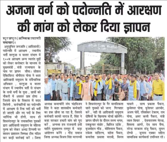 मूलनिवासी अधिकारगण छत्तीसगढ़ जिला- ईकाई सूरजपुर के द्वारा स्थानीय भर्ती पद्दोनती में 100%आरक्षण लागू करने एवम फर्जी जाति