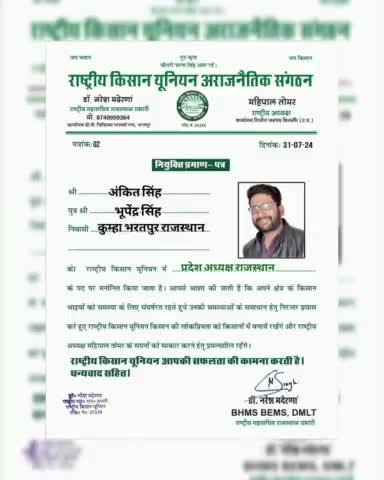 राष्ट्रीय किसान यूनियन के राष्ट्रीय महासचिव राजस्थान प्रभारी डॉ.नरेश मदेरणा ने राजस्थान की कार्यकारिणी बनाते हुए प्रदेश अध्यक्ष अंकित कुम्हा को नियुक्त किया साथ ही कार्यकारणी बनाने के दिए निर्देश