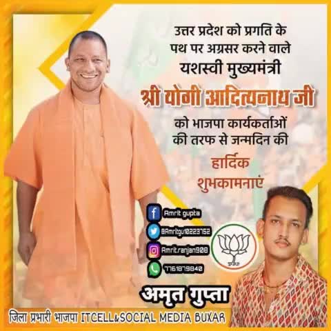 उत्तर प्रदेश के यशस्वी #मुख्यमंत्री व भगवा रक्षक महंत श्री #योगी_आदित्यनाथ जी महाराज जी को जन्मदिन की हार्दिक बधाई व शुभ