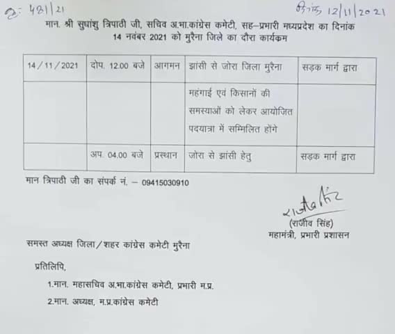 अ. भा. कांग्रेस कमेटी के सचिव एवं सह-प्रभारी मध्यप्रदेश आदरणीय "श्री सुधांशु त्रिपाठी जी" के नेतृत्व में महंगाई, बेरोजगारी एवं किसानों की समस्याओं को लेकर दिनांक 14/11/2021, दिन रविवार को जौरा में पदयात्रा आयोजित की जा रही है।