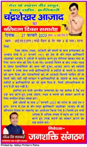 27 फरवरी को पटना में जनशक्ति संगठन द्वारा मनाया जायेगा चंद्राशेखर आजाद का बलिदान दिवस समारोह