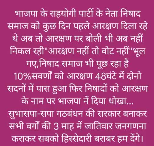 भाजपा के सहयोगी पार्टी के नेता निषाद समाज को कुछ दिन पहले आरक्षण दिला रहे थे अब तो आरक्षण पर बोली भी अब नहीं निकल रही"आरक्षण नहीं तो वोट नहीं"