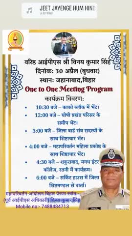 30 अप्रैल बुधवार को 10 बजे काको ब्लॉक सभागार, 12 बजे घोषी ब्लॉक ग्राम प्लेक्स भवन एवं 4 बजे मगध इंटर कॉलेज शकुराबाद में आप सभी से बिहार में एस टी एफ पुलिस का गठन करने वाले सह महापरिवर्तन आंदोलन बिहार वरिष्ठ आई पी एस विनय कुमार सिंह जी