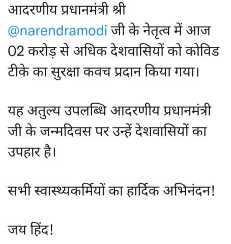 आदरणीय प्रधानमंत्री श्री @narendramodi जी के नेतृत्व में आज 02 करोड़ से अधिक देशवासियों को कोविड टीके का सुरक्षा