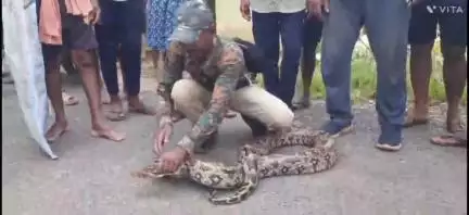 ବୈପାରୀଗୁଡା ବନାଞ୍ଚଳ ଅଧିନସ୍ତ ବରଗାଁରୁ ଅଜଗର ସାପ ଉଦ୍ଧାର l 15 ଫୁଟିଆ ଅଜାଗର ସାପ ଉଦ୍ଧାର କରିଛନ୍ତି ସ୍ନେକ ହେଲ୍ପ ଲାଇନ କର୍ମକର୍ତ୍ତା ଡ଼ମ୍ବୁର ମାଝୀ l ଖାଦ୍ୟ ଅନ୍ୱେଷଣ ରେ ଗାଁ ମୁହାଁ ହୋଇ ରାସ୍ତା ପାର୍ଶ୍ଵରେ ବୁଲୁଥିଲା ଅଜଗର ସାପ l ଏହାକୁ ଦେଖି ଗାଁ ଲୋକେ ଭୟଭୀତ ହୋଇପଡ଼ିଥିଲେ l ଗାଁ ଲୋକେ ବୈପାରୀଗୁଡା ରେଞ୍ଜର ଙ୍କୁ ଜଣାଇଥିଲେ l ରେଞ୍ଜର ସନ୍ଦେପ ପାଣିଗ୍ରାହୀଙ୍କ ନିର୍ଦେଶ କ୍ରମେ ସ୍ନେକ ହେଲ୍ପ ଲାଇନ କର୍ମକର୍ତ୍ତା ଡ଼ମ୍ବୁର ମାଝୀ ବରଗାଁ ରେ ପହଂଚି 15 ଫୁଟିଆ ଅଜଗର ସାପ ଉଦ୍ଧାର କରିଥିଲେ l ସାପର ଓଜନ ପାଖାପାଖି 25କିଲୋ ହେବ ବୋଲି ଜଣା ପଡିଛି l