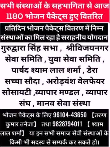 विजयनगर: श्रीविजयनगर में विभिन्न सस्थाओं द्वारा 1200 फूड पैकेट का किया गया वितरण