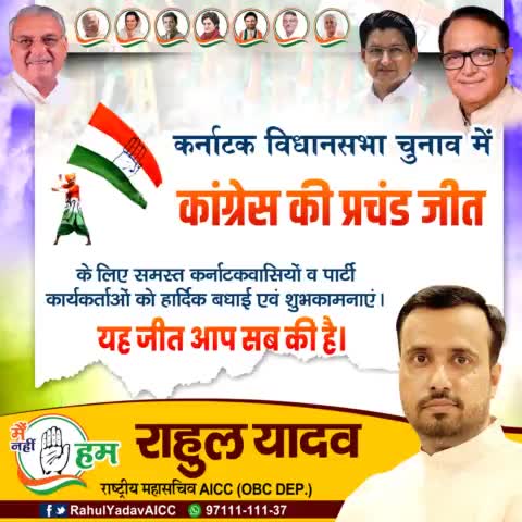 कर्नाटक विधानसभा चुनाव में कांग्रेस की प्रचंड जीत के लिए समस्त देशवासियों व पार्टी कार्यकर्ताओं को हार्दिक बधाई एवं शुभकामनाएं..