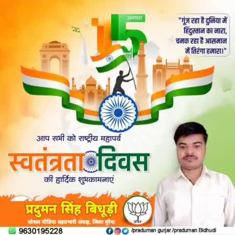 स्वतंत्रता दिवस की हार्दिक शुभकामनाएं सभी देशवासियों 🇮🇳🙏🙏जय हिंद जय भारत प्रदुमन बिधूड़ी सोशल मीडिया सह प्रभारी भाजपा नगर मंडल अंबा