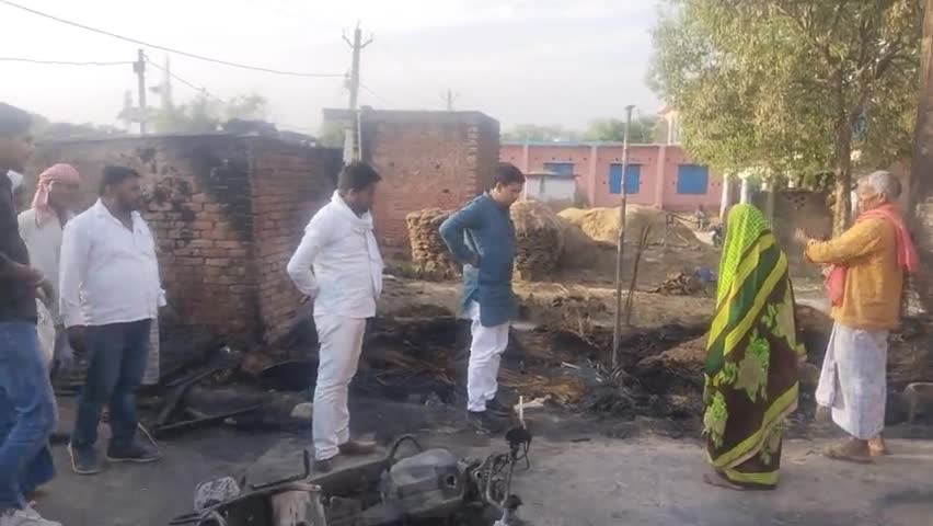 अखिनी में आग लगने से एक व्यक्ति की झुलसने की खबर पाने के बाद परिवार जनों से मिलने पहुंचे बसपा नेता सतीश यादव।