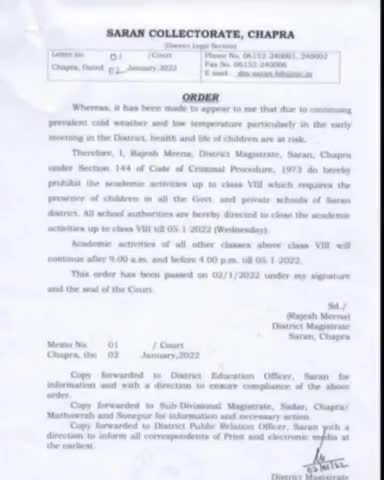 शीतलहर के मध्य नजर सारण के सभी सरकारी और प्राइवेट स्कूलों के वर्ग 8 तक की कक्षाएं 5 जनवरी तक बंद रहेंगी