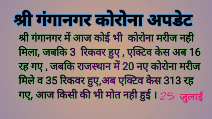 #श्रीगंगानगर में आज कोई भी कोरोना मरीज नही मिला, जबकि 3 रिकवर हुए , एक्टिव केस अब 16 रह गए , जबकि राजस्थान में 20 नए