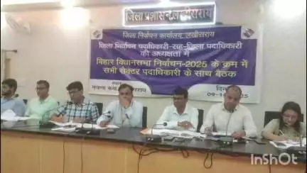 जिला मुख्यालय स्थित मंत्रणा कक्ष सभागार में सेक्टर पदाधिकारियों की बैठक गुरुवार की दोपहर 12 40 पर आयोजित की गई। बैठक की अध्यक्षता जिला निर्वाचन पदाधिकारी सह जिलाधिकारी मिथिलेश मिश्र ने की। बैठक में डीडीसी सुमित कुमार, एसडीओ प्रभाकर कुमार, समेत जिला और प्रखंड स्तरीय अधिकारी उपस्थित रहे।