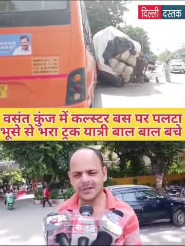 दिल्ली के वसंत कुंज इलाके में क्लस्टर बस के ऊपर पलटा भूसे से भरा ट्रक यात्री बाल बाल बचे