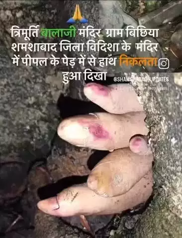 जिला विदिशा के ग्राम बिछिया में त्रिमूर्तिधाम लाजी के दरबार में #पीपल के वृक्ष के नीचे शिवलिंग के हाथ दिखाई दे रहा है
