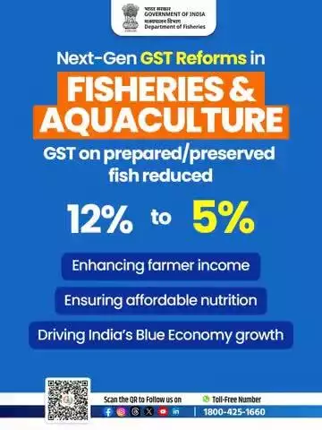 "#NextGenGST is transforming Indian fisheries! GST on prepared/preserved fish is now just 5%, making aquaculture more viable and profitable. #NextGenGST #56thGSTCouncil #AquacultureBoost #Fisheries