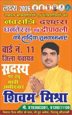 आप सभी क्षेत्रवासीय एवं ग्राम वासियों के आशीर्वाद एवं स्नेह का वार्ड नंबर 11 से जिला पंचायत सदस्य पद हेतु भावी उम्मीदवार शिवम मिश्रा आपका बेटा