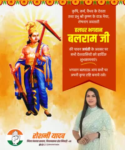 कृषि, कर्म ,वैभव के देवता तथा प्रभु श्री कृष्ण के दाऊ भैया, शेषनाग अवतारी हलधर भगवान श्री बलराम जी की पावन जयंती के अवसर पर सभी देशवासियों को हार्दिक शुभकामनाएं।! Roshni Yadav