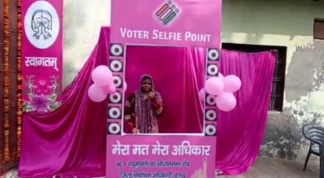 गढ़मुक्तेश्वर: गढ़ विधानसभा में निर्वाचन आयोग ने मतदान केंद्र पर महिलाओं के लिए अलग से बनाया पिंक सेल्फी प्वाइंट