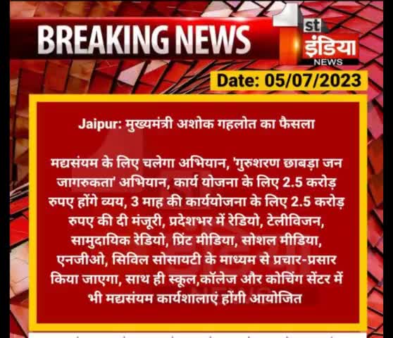 आभार राजस्थान के गांधीवादी मुख्यमंत्री अशोक गहलोत जी का आभार प्रकट करती हूं जिन्होंने शहीद गुरुशरण छाबड़ा जन जागरूकता नशा मुक्ति अभियान चलाने का फैसला किया है। 3 माह में 2.5करोड़ रुपए का प्रचार प्रसार में राजस्थान सरकार व्यय करेगी। राजस्थान