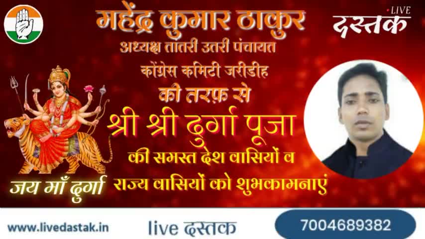 तातरी उत्तरी पंचायत अध्यक्ष महेंद्र कुमार ठाकुर की ओर से प्रदेश वासियों को श्री श्री दुर्गा पूजा की हार्दिक शुभकामनाएं 🙏