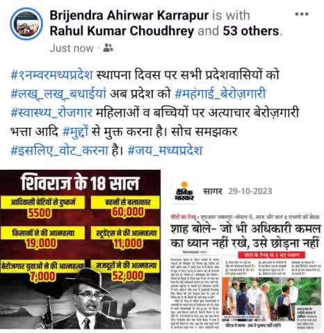 मध्यप्रदेश स्थापना दिवस पर सभी प्रदेशवासियों को #लख्_लख्_बधाईयां अब प्रदेश को #महंगाई_बेरोज़गारी #स्वास्थ्य_रोजगार महिलाओं व बच्चियों पर अत्याचार बेरोज़गारी भत्ता आदि #मुद्दों से मुक्त करना है। सोच समझकर #इसलिए_वोट_करना है।