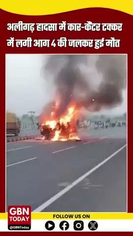 अलीगढ़ में भीषण सड़क हादसा! टायर फटने से बेकाबू हुई कार डिवाइडर पार कर कैंटर से टकराई, टक्कर के बाद लगी आग में 4 लोगों की जिंदा जलकर दर्दनाक मौत हादसे ने इलाके में मचा दी सनसनी, मौके पर राहत व बचाव कार्य जारी। #gbntoday #AligarhAccident #UPNews #RoadTragedy #FireAccident #BreakingNews #CarCrash #BurntAlive #UttarPradeshNews #SadNews #HighwayAccident #TragicIncident