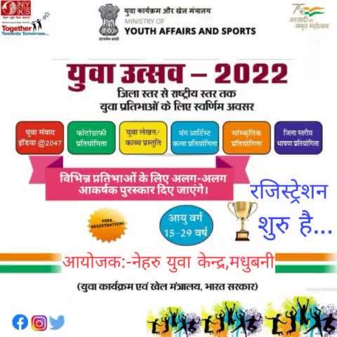 नेहरु युवा केन्द्र मधुबनी द्वारा जिला स्तरीय युवा उत्सव मनाया जायेगा । आप सभी प्रतिभावान प्रतिभागी को नेहरू युवा केन्द्र आपकी प्रतिभा को प्रखंड स्तर से राष्ट्रीय स्तर तक प्रदर्शित करने के लिये मंच दे रही है । इच्छुक प्रतिभागी भाग ले सकते है