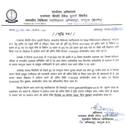 श्रीमति देवेन्द्र कुमारी सिंहदेव शासकीय चिकित्सा महाविद्यालय फार्म जमा की तारिक को बड़ाई गई है जो 24/08/2022 तक होगी।