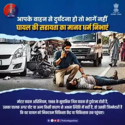 *@policerajasthan ——सड़क दुर्घटना होने पर वाहन चालक के भाग जाने के कारण घायल की मृत्यु हो जाना आम है। मोटर वाहन अधिनियम, 1988 के मुताबिक जिस वाहन से दुर्घटना होती है, उसका चालक अगर चोट या अन्य किसी कारण से अक्षम स्थिति में नहीं है ।