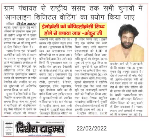 गरूदेव अरविंद 'अंकुर' जी ने चुनाव आयोग को पत्र भेजा कि ऑनलाइन वोटिंग का प्रयोग किया जाए, जमानत राशि भी तुरंत समाप्त करें
