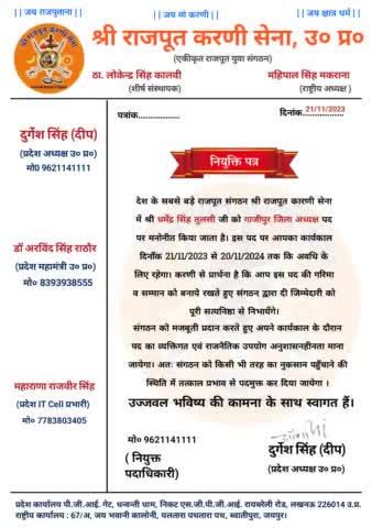 श्री राजपूत करणी सेना गाजीपुर के जिलाध्यक्ष बने धर्मेंद्र सिंह तुलसी