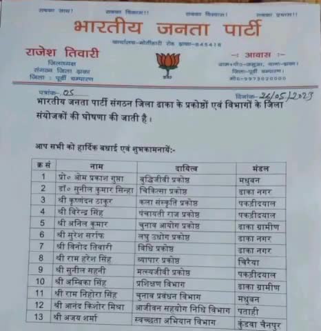 राजेपुर नवादा ग्रामवासी श्री कृष्णनंदन ठाकुर को भारतीय जनता पार्टी संगठन जिला ढाका का जिला संयोजक बनाया गया है ।
