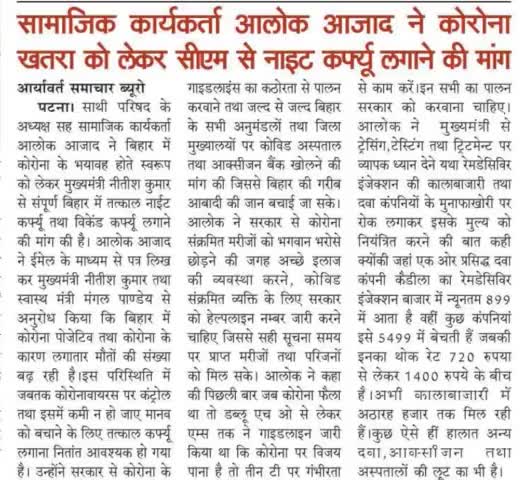 बिहार में लगे नाइट,विकेंड कर्फ्यू ,जिलों में खुले कोरोना अस्पताल-आलोक आजाद रेमडेसिविर इंजेक्शन तथा आक्सीजन की व्यवस्थाहो