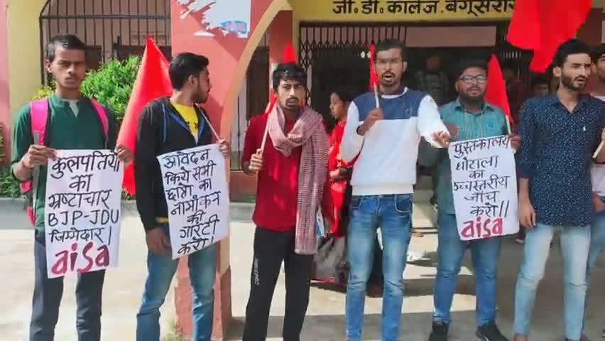 आवेदन किये गए सभी छात्रों का नामांकन की गारेंटी करने और पूरे बिहार के विश्वविद्यालयों में पुस्तक घोटाला की उच्च स्तरीय जांच के मांगों के साथ आइसा बेगूसराय द्वारा GD कॉलेज में किया गया प्रदर्शन !