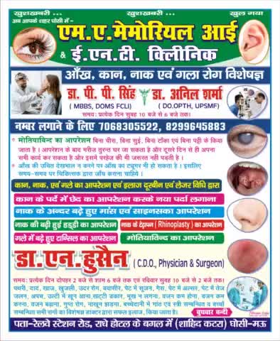 एम ए मेमोरियल आई एंड ईएनटी क्लिनिक रेलवे स्टेशन रोड राधे होटल के बगल में सैय्यद शाहिद कटरा घोसी मऊ 8299645883