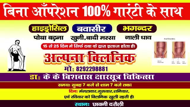 बिना चीरफाड़ गारंटी इलाज।हाईड्रोसील,बावासीर,भगन्दर पोथा बढ़ना ,खुनी,बादी मस्सा ,नाली घाव☎️8292298881 स्थान: दरौली।