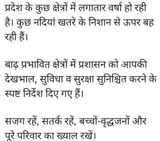 प्रदेश के कुछ क्षेत्रों में लगातार वर्षा हो रही है। कुछ नदियां खतरे के निशान से ऊपर बह रही हैं। सतरक रहे सुरक्षित रहे