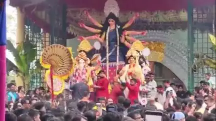 জলপাইগুড়ি শহরে বিজয়া দশমীর বিকেল থেকেই শুরু হয়েছে প্রতিমা বিসর্জনের মহোৎসব। ঐতিহ্যবাহী রাজবাড়ীর বিসর্জনকে ঘিরে দেখা গেল শত শত মানুষের ভিড়। ঢাকের তালে, নাচ-গানে, উলুধ্বনি ও শঙ্খধ্বনিতে মাতোয়ারা পরিবেশে মা দুর্গাকে বিদায় জানানো হয় রাজবাড়ী দিঘিতে। ভক্তদের চোখে জল, তবু উৎসবমুখর আবহে বিদায়ের মুহূর্ত ছিল আবেগঘন। পাশাপাশি পাতকাটা কলোনি অগ্রণী সংঘের দুর্গোৎসবের বিসর্জনেও ভক্তরা সমান আবেগে মাতৃবিদায় দেন। শুধু রাজবাড়ী বা পাতকাটা নয়, জলপাইগুড়ির বিভিন্ন দুর্গোৎসব কমিট
