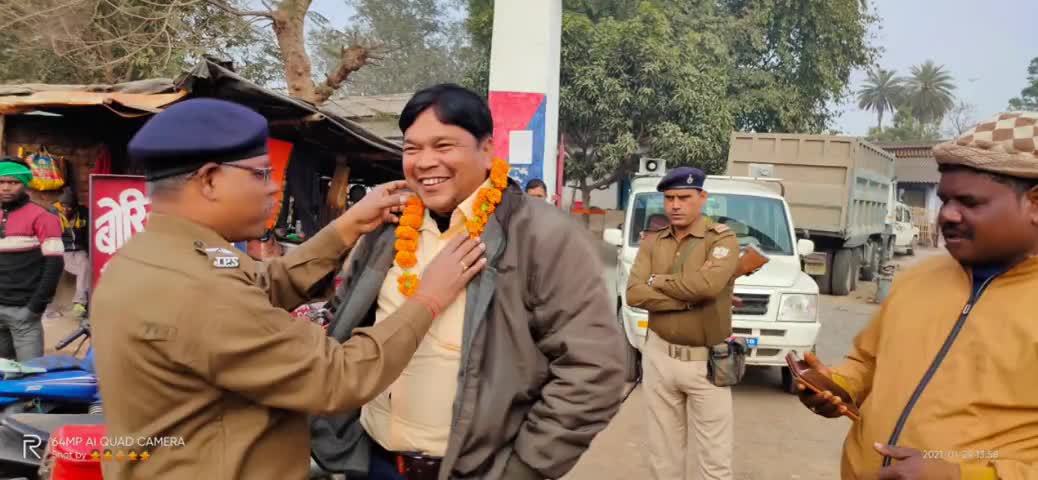 बोरियो: बोरियो थाना मुख्य गेट पर वाहन जांच अभियान के दौरान पुलिस ने बिना हेलमेट वाले बाइक चालकों को माला पहनाया