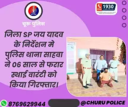 #churupolice जिला SP जय यादव के निर्देशन मे पुलिस थाना साहवा ने 06 साल से फरार स्थाई वारंटी को किया गिरफ्तार।