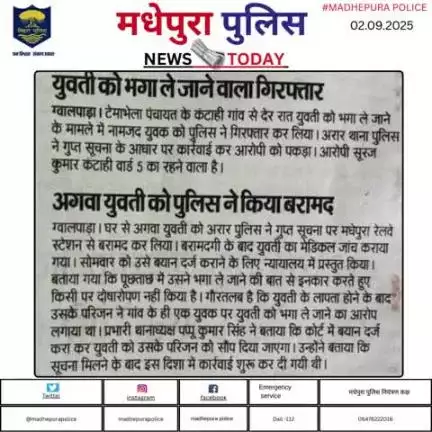 आज दिनांक-02.09.2025 के अखबार में प्रकाशित #मधेपुरा पुलिस से जुड़ी खबरें।