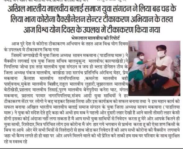 मालवीय बलाई समाज युवा संगठन ने लिया बढ चढ के हिसा व युवा जिलाध्यक्ष ने किया युवा बे वैक्सीन लगाने का अनुरोध