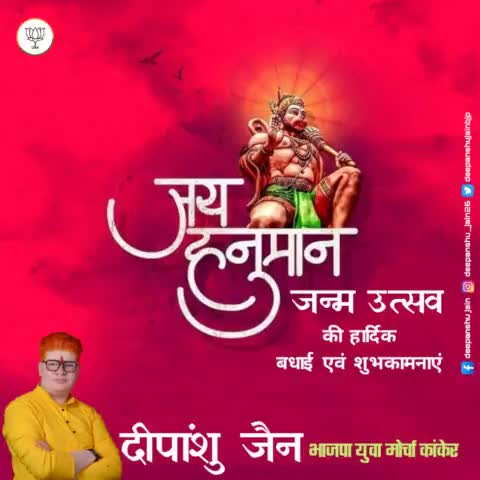 रघुपतिप्रियभक्तं वातजातं नमामि। "श्री हनुमान जन्मोत्सव" पावन पर्व की आप सभी को बहुत-बहुत बधाई व शुभकामनाएँ। 🚩🚩🚩🚩🚩🚩🚩🚩🚩