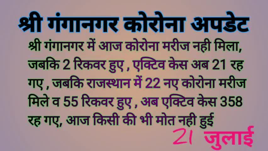 #श्रीगंगानगर में आज कोरोना मरीज नही मिला, जबकि 2 रिकवर हुए , एक्टिव केस अब 21 रह गए , #राजस्थान