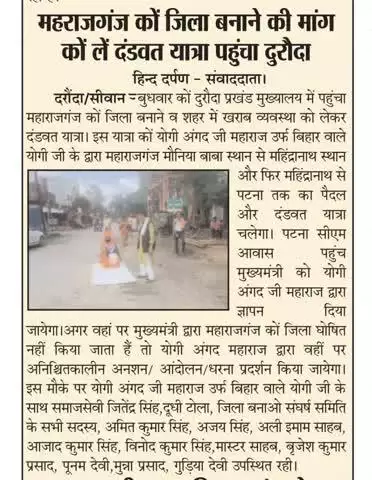 दंडवत यात्रा का तीसरा दिन दारौंदा प्रखंड में पहुंचा3 सितंबर 2025 को महाराजगंज जिला बनाने को लेकर और खराब व्यवस्था को लेकर दंडवत यात्रा योगी अंगद जी महाराज उर्फ बिहार वाले योगी जी का महाराजगंज मौनिया बाबा स्थान से महिंद्रानाथ स्थान और फिर वह