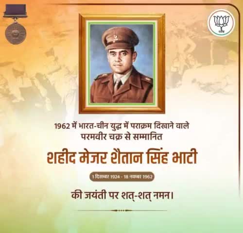 1962 में भारत चीन युद्ध में पराक्रम दिखाने वाले परमवीर चक्र से सम्मानित से मेजर शैतान सिंह भाटी की जयंती पर शत शत नमन।