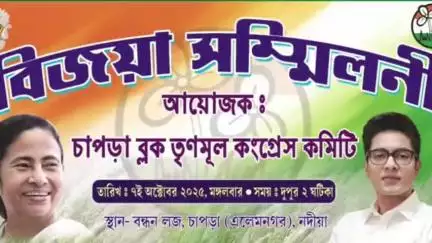 প্রসঙ্গত রাজ্য তৃণমূলের নির্দেশে রাজ্যজুড়ে প্রতিটি ব্লকে বিজয়া সম্মিলনীর নির্দেশ। মান্যতা দিয়ে এদিন চাপড়া ব্লক তৃণমূল কমিটির উদ্যোগে চাপরা ব্লকের একটি বেসরকারি লজে বিজয়া সম্মেলনে অনুষ্ঠিত হলো। এদিনের এই বিজয় সম্মিলনীতে উপস্থিত ছিলেন রাজ্যের মন্ত্রী উজ্জ্বল বিশ্বাস সাংসদ মহুয়া মৈত্র যুব সভাপতি অয়ন দত্ত সভাধিপতি তারান্নুম সুলতানা মীর সহ বিধায়ক এবং ব্লক ও জেলা নেতৃত্ব।