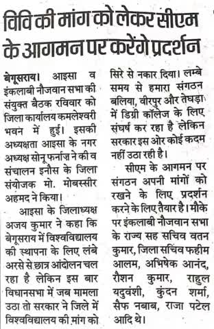 बेगूसराय में मुख्यमंत्री के आगमन पर विश्वविद्यालय की मांग को लेकर होगा आक्रोशपूर्ण प्रदर्शन !