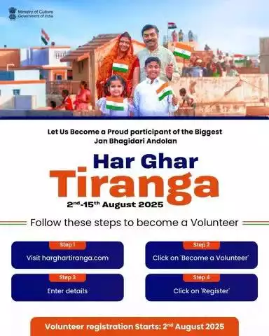 🇮🇳 Be a proud part of the biggest Jan Bhagidari movement – #HarGharTiranga! Become a Tiranga Volunteer, inspire others to hoist the National Flag till 15th August, and upload your #SelfieWithTiranga at harghartiran
