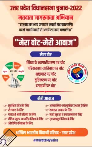 मेरा वोट और मेरी आवाज योजना के तहत अखिल भारतीय विद्यार्थी परिषद के कार्यकर्त देश के 5 राज्यों में हो रहे चुनाव के इस महापर्व में देश की जनता के बीच में जाकर शत-प्रतिशत मतदान के लिए जागरूक कर रहे हैं और वोट की महत्वता को जनता को समझा रहे हैं